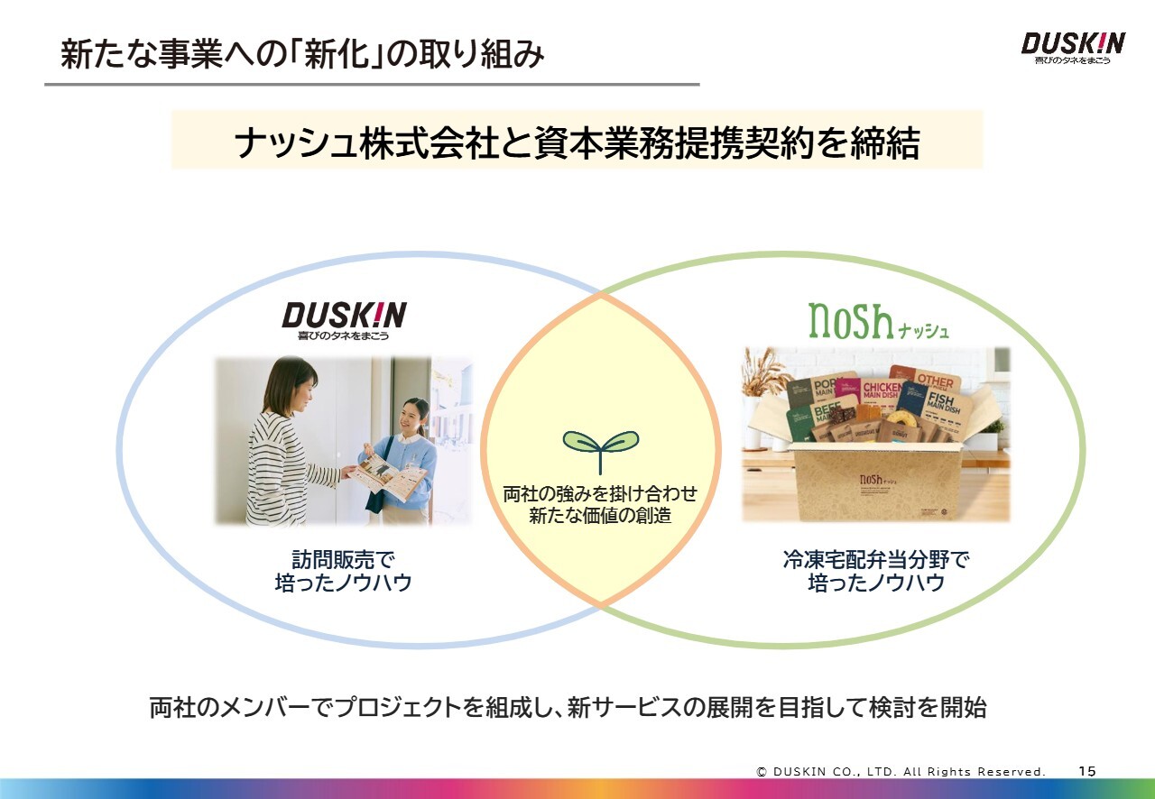 当社の新たな事業への「新化」についての取り組みをご紹介します。本年7月に、冷凍宅配弁当の「ナッシュ」などを運営しているナッシュ株式会社と資本業務提携を締結しました。当社は、リアルな顧客接点を強みに事業展開を行っています。特に訪問販売グループでは、シニア層を中心に長年の信頼を築いてきた顧客基盤があります。