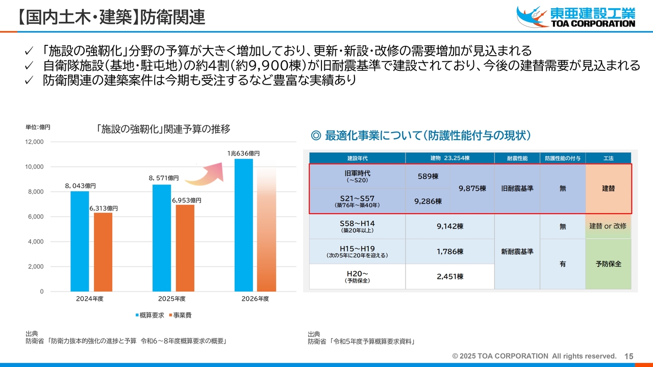 国内土木事業と国内建築事業の両方にまたがる防衛関連についてご説明します。スライド左側のグラフにあるように、「施設の強靭化」分野の予算が大きく増加しています。これは更新・新設・改修の需要が増加すると見込まれています。