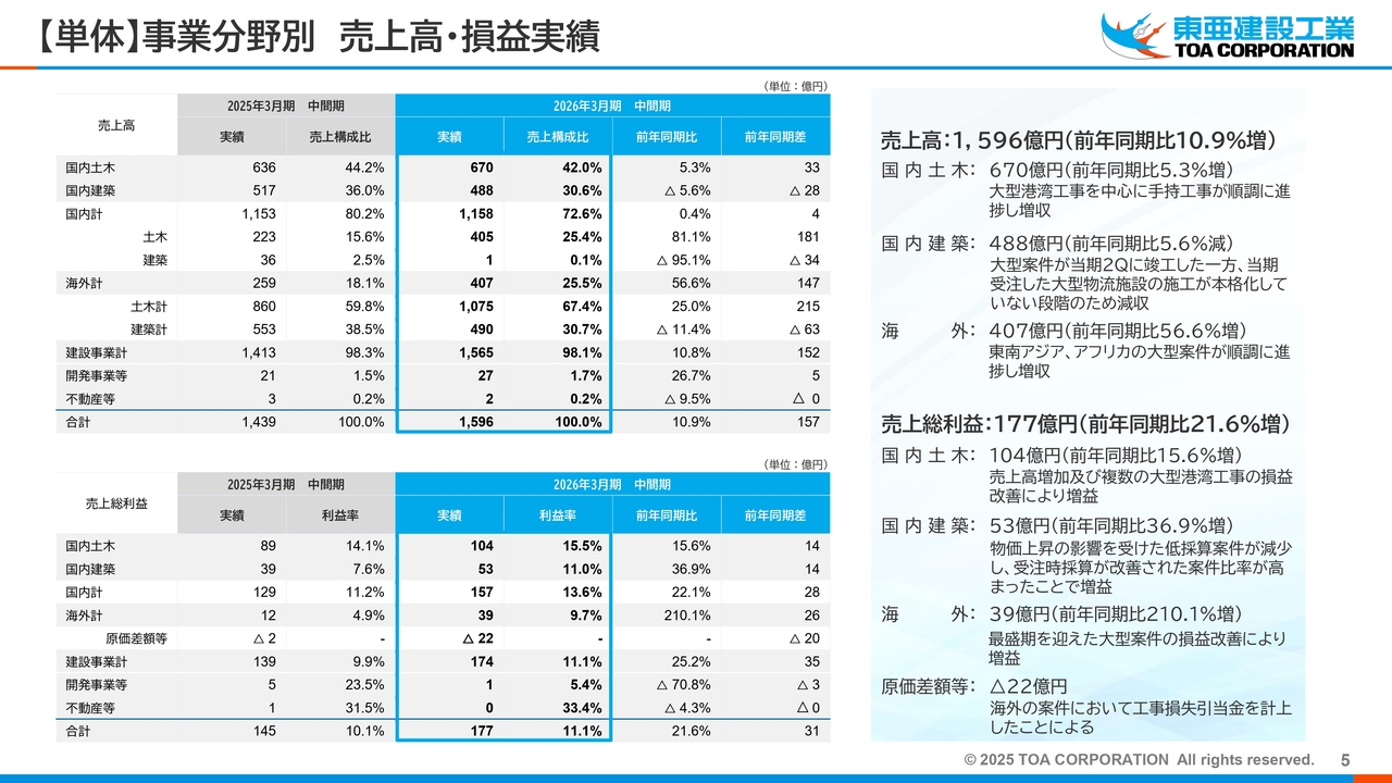 続いて、スライド右側下段の売上総利益についてご説明します。国内土木事業は、前年同期比15.6パーセント増の104億円となりました。売上高の増加および複数の大型港湾工事における損益改善により、増益となっています。国内建築事業は、前年同期比36.9パーセント増の53億円となりました。物価上昇の影響を受けた低採算案件が減少し、受注時点で採算が改善された案件比率が高まったことで、増益となっています。
