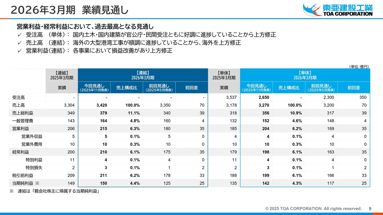 こちらの要因として、前年同期の手持高が約5,000億円であったのに対し、今期、2025年9月末時点の手持高は5,090億円と増加しており、施工能力などを勘案した計画的なものとなっていることが挙げられます。また、海外事業では受注の減少が大きい状況ですが、これは今期上期に受注予定だった大型案件が前年度末に受注計上されたことによる影響です。