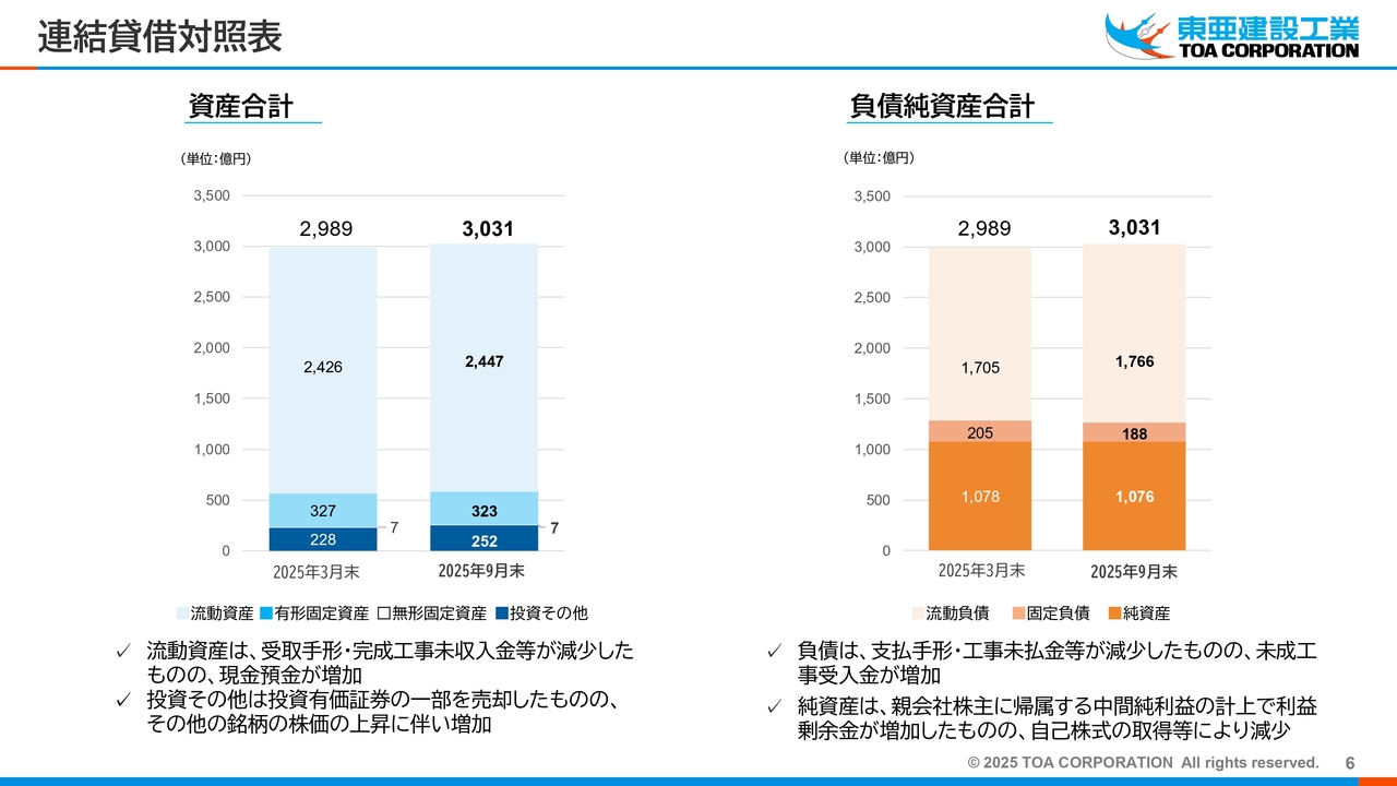 連結貸借対照表についてです。総資産は3,031億円に増加しました。内訳として、流動資産では大型工事の工事代金の回収が進んだ結果、受取手形や完成工事未収入金が減少しましたが、現預金は若干増加し、適正水準を維持しています。投資その他については、投資有価証券の一部を売却したものの、その他銘柄の株価上昇に伴い増加しました。