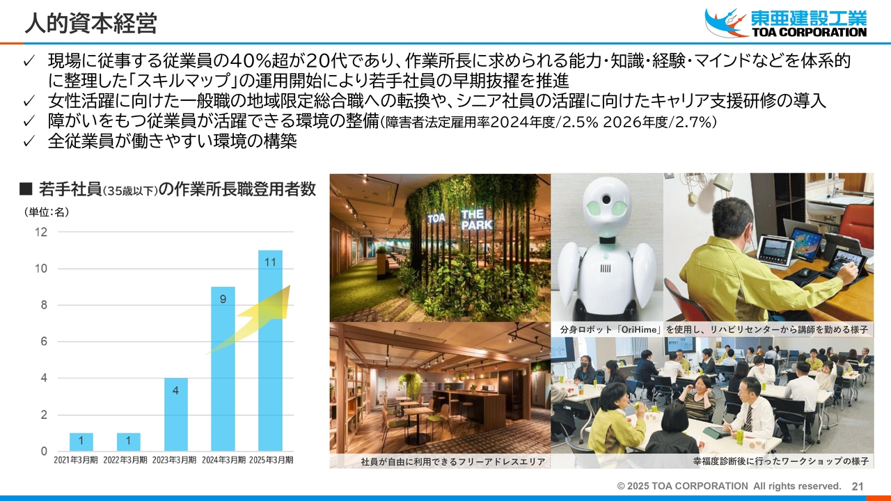 人的資本経営について、より詳細にご説明します。現在、当社では現場に従事する従業員のうち、20代の割合が45パーセントに達しており、採用活動に力を入れてきた成果が表れています。