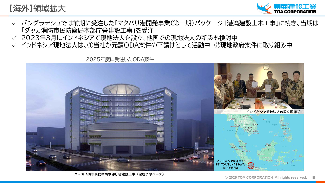 また、スライド右側の写真にあるように、2023年3月にインドネシアで現地法人PT. TOA TUNAS JAYA INDONESIAを設立しました。スライド右上の写真は、設立の調印式の様子です。