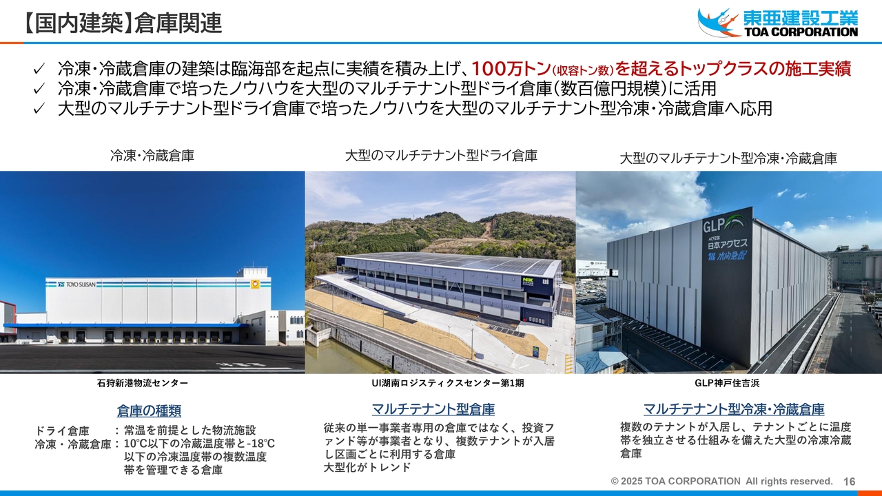 スライドに写真も掲載していますが、弊社は昔から冷凍・冷蔵倉庫の建築において、臨海部で強みを持っており、豊富な実績を積み上げてきました。収容トン数で100万トンを超える施工実績を誇り、具体的な統計データを示すことは難しいものの、ほぼトップクラスの施工実績であることが弊社の強みとなっています。