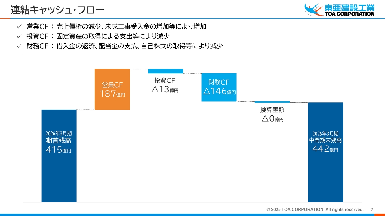 連結キャッシュ・フローについてです。営業キャッシュ・フローは工事代金回収が進み、売上債権の減少や未成工事受入金の増加などにより、187億円の増加となりました。一方、投資キャッシュ・フローは固定資産の取得による支出などにより、13億円の減少となっています。
