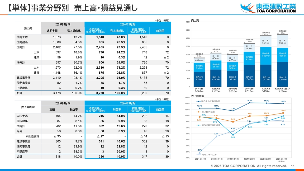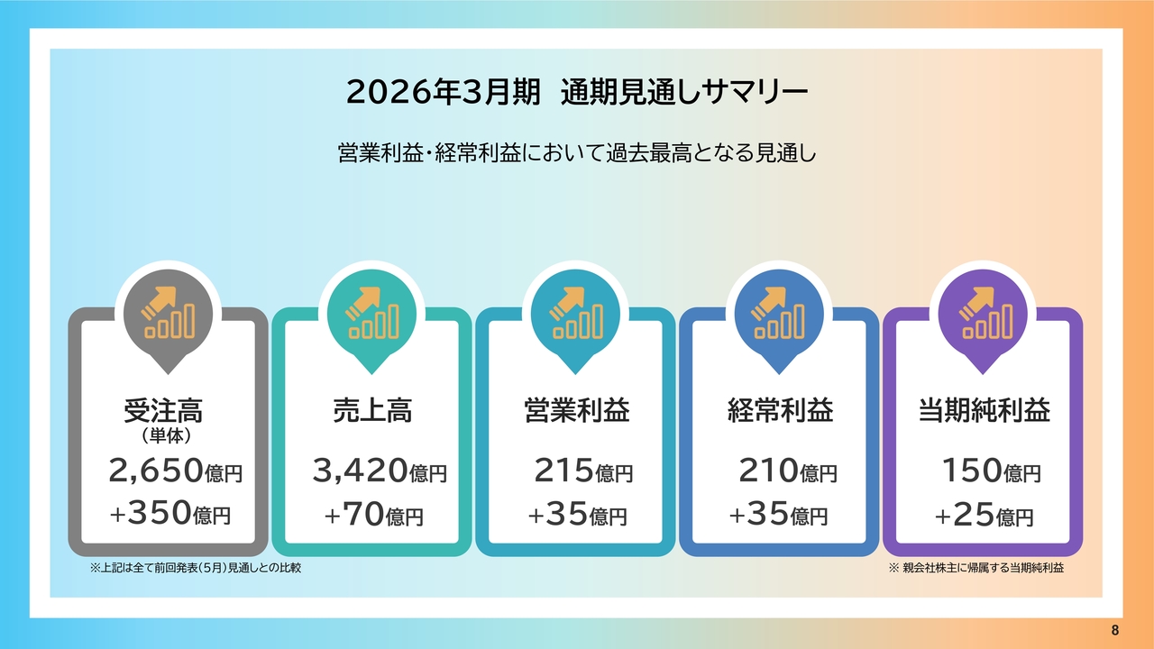売上高や売上総利益については、一部大型案件の設計変更など、不確定な要素は織り込んでいません。下期においても設計変更の獲得などを通じて、さらなる利益改善を図りたいと考えています。