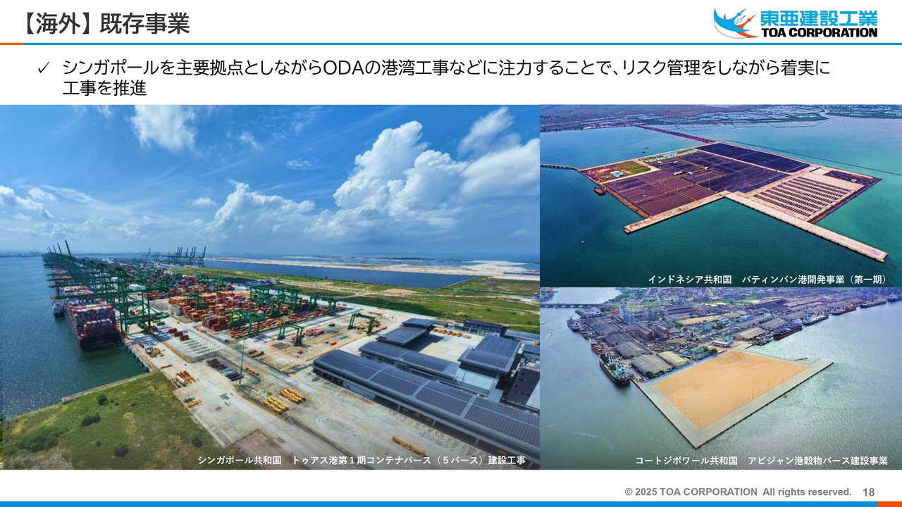 海外事業の既存事業についてご説明します。スライド左側の写真は、シンガポールのトゥアス港で、日本では見ることのできない大型のコンテナバースがあり、岸壁延長が4キロメートルも続いています。