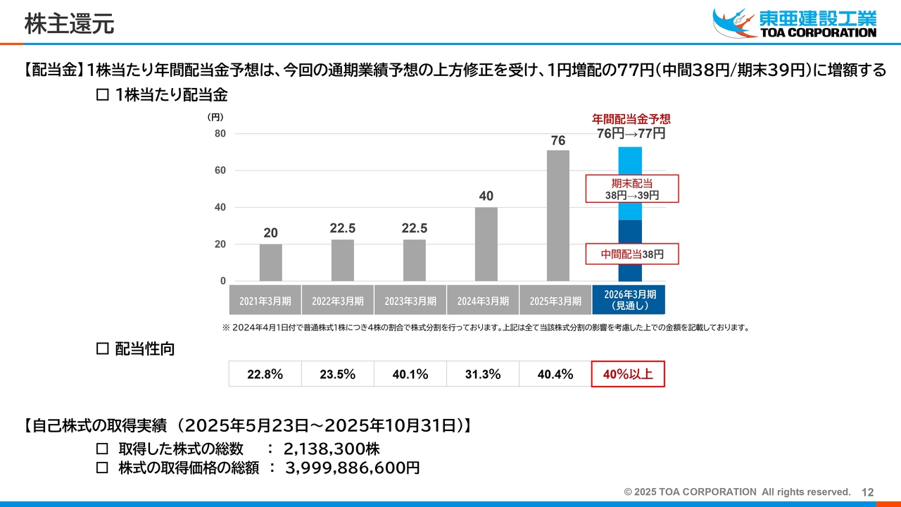 株主還元についてご説明します。1株当たり年間配当金予想は、今期の通期業績予想の上方修正を受けて、1円増配の77円(中間38円、期末39円)に増額する予定です。配当性向は、目標値の40パーセントを超える水準となります。