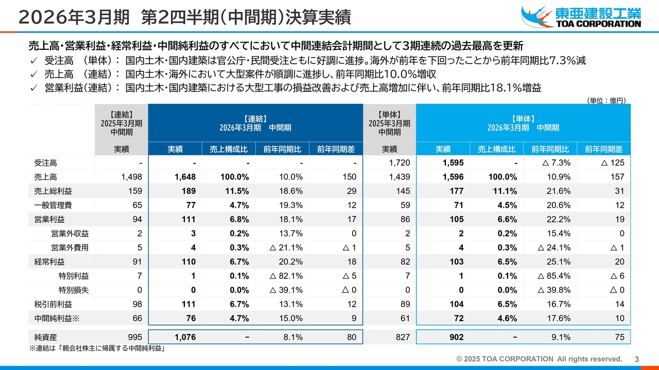 【QAあり】東亜建設工業、売上高・利益は上期として3期連続過去最高を更新し通期業績見通しを上方修正 年間配当も増配へ