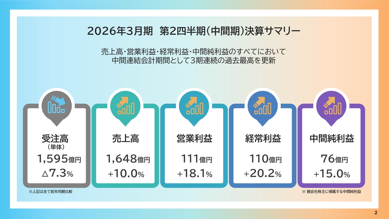 中尾剛氏:代表取締役専務経営管理本部長の中尾です。2026年3月期第2四半期の決算サマリーについてご説明します。この第2四半期では、売上高、営業利益、経常利益、中間純利益のすべてで、3期連続の過去最高を更新しました。