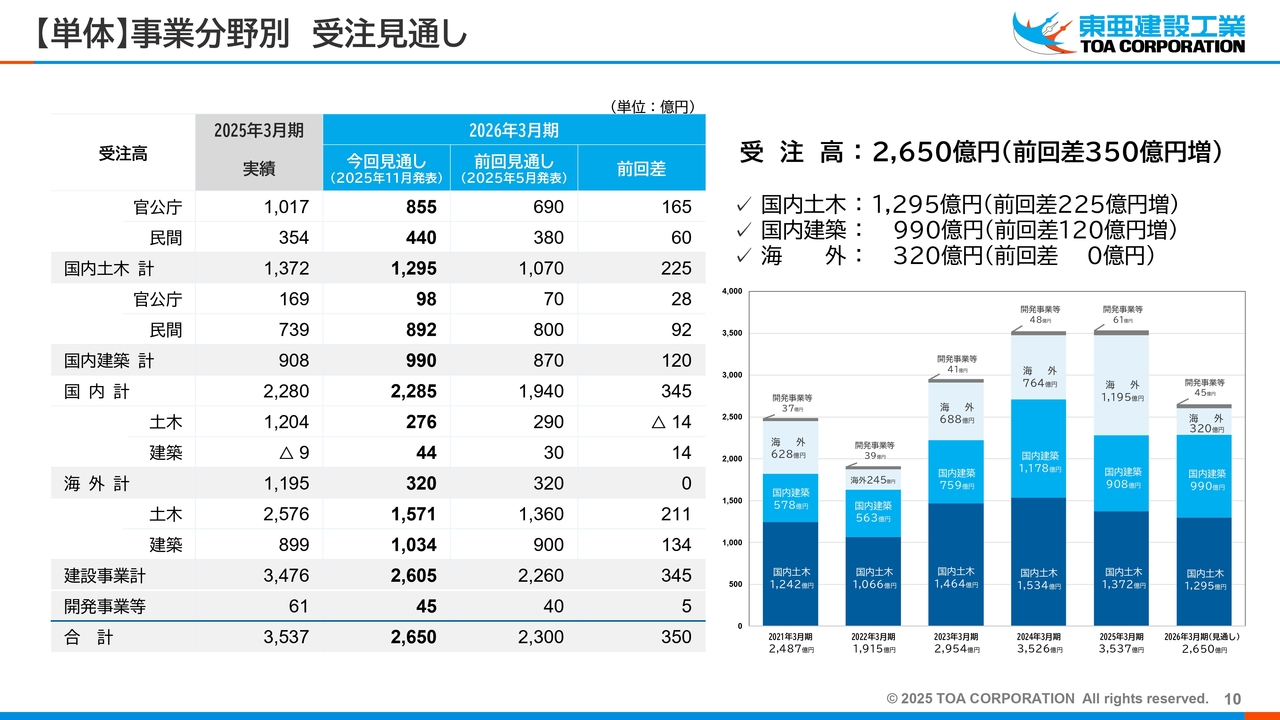 単体事業分野別の受注見通しについてご説明します。国内土木事業については、官庁案件を中心に予定外の受注や設計変更を獲得できたことから、225億円の上方修正となっています。