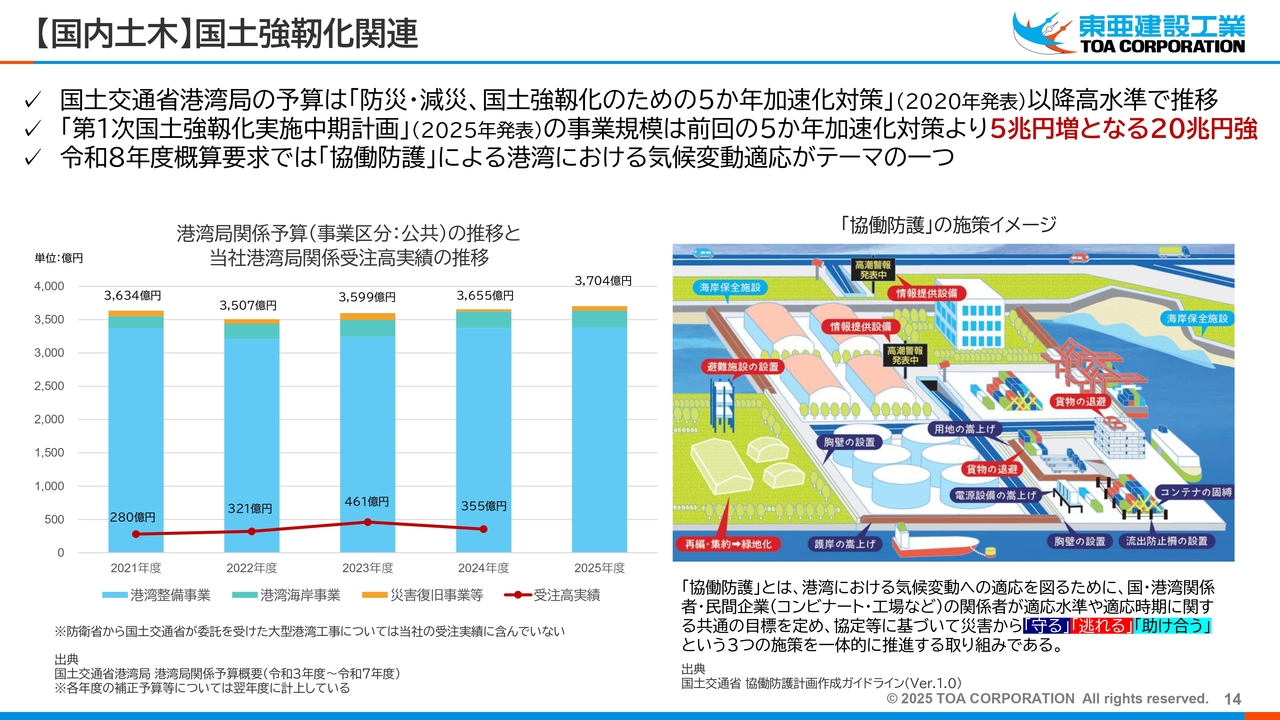 まず、国内土木事業の国土強靭化関連についてです。国土交通省港湾局の予算は、2020年に発表された「防災・減災、国土強靭化のための5か年加速化対策」以降、高水準で推移しています。2025年に発表された「第1次国土強靭化実施中期計画」の事業規模は、前回の5か年加速化対策より5兆円増加しており、現在は20兆円強という規模になっています。