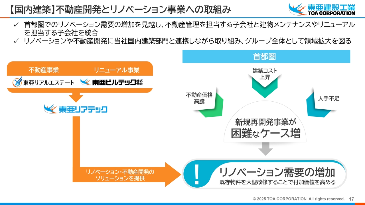 スライド左上に記載のとおり、これまで不動産管理を担当していた子会社、東亜リアルエステートと建物のメンテナンスやリニューアルを担当していた子会社、東亜ビルテックを統合し、我々建設本体と一体化することで、不動産開発とリノベーションに取り組んでいます。