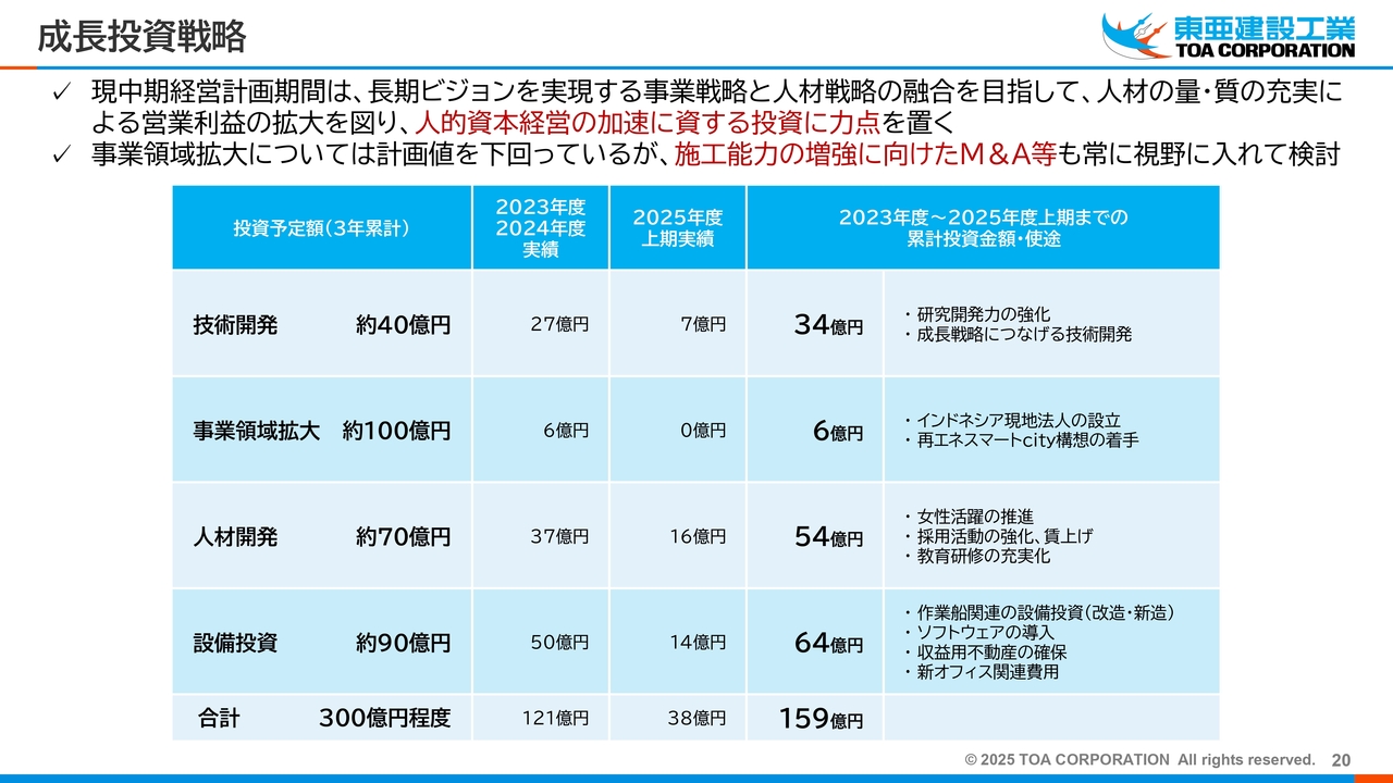 スライドに表がありますが、技術開発、事業領域拡大、人材開発、設備投資を合わせて、合計300億円程度の投資を想定しています。