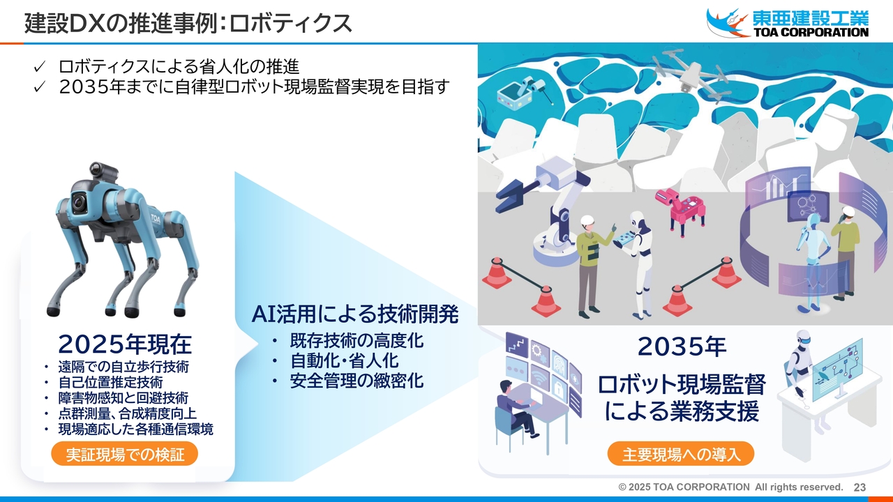 自動化や省人化、安全管理への活用を進めるとともに、そうした技術を蓄積し、2035年にはロボットによる現場監督の業務支援を実現したいと考えています。