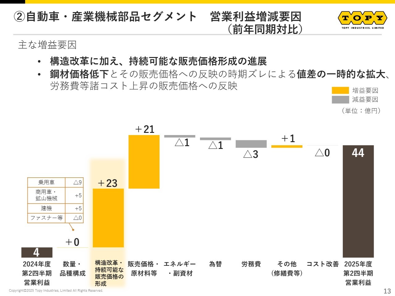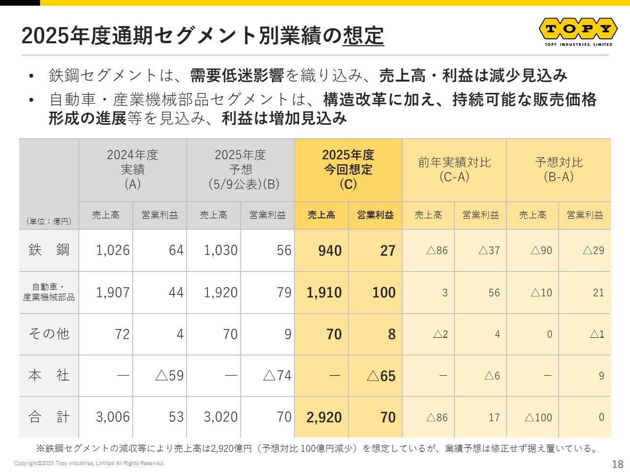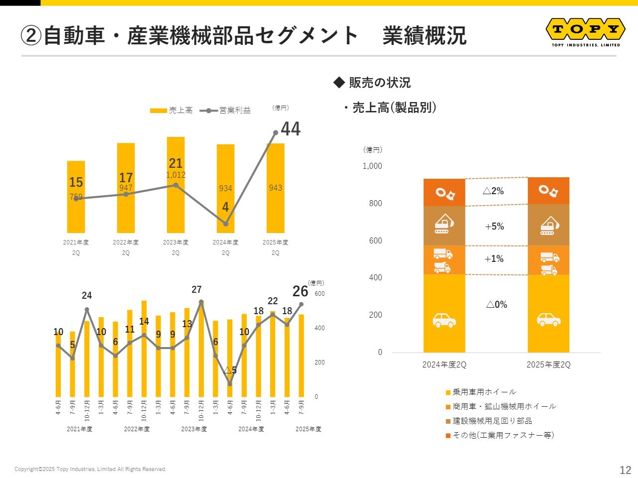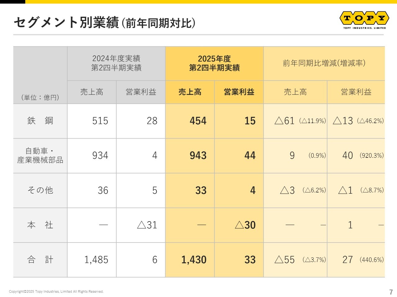 こちらに関しては、自動車・産業機械部品セグメントにおける構造改革や持続可能な販売価格の形成を確実に進め、通期業績予想の達成を目指したいと考えています。