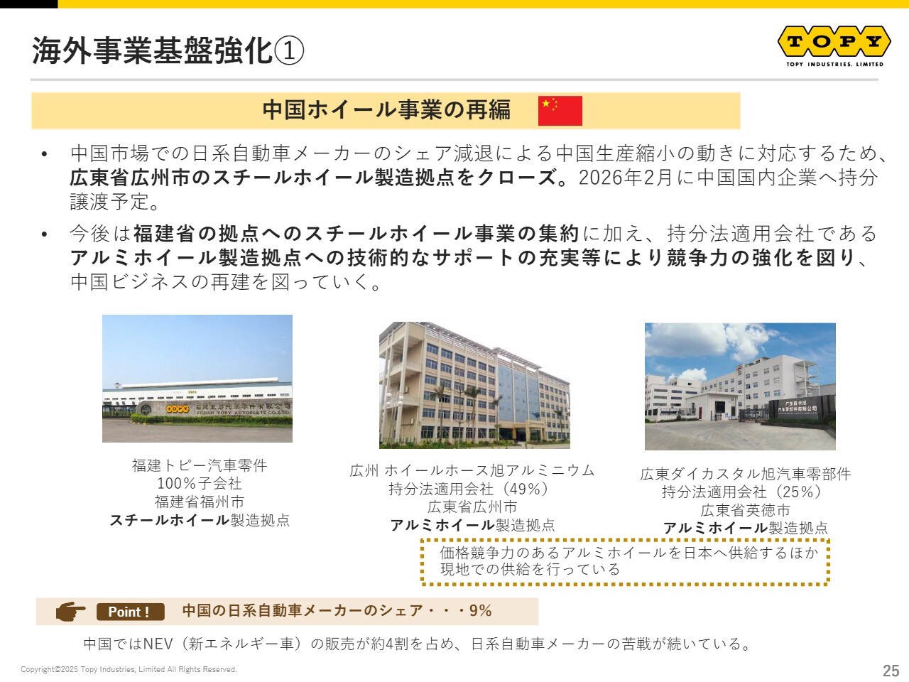次に、海外事業の基盤強化についてです。1つ目に、中国ホイール事業の再編を実施しました。中国市場での日系メーカーのシェア低迷や、中国生産縮小の動きに対応するため、広東省広州市のスチールホイール製造拠点をクローズし、2026年2月に中国国内企業へ生産拠点を持分譲渡することを決定しています。