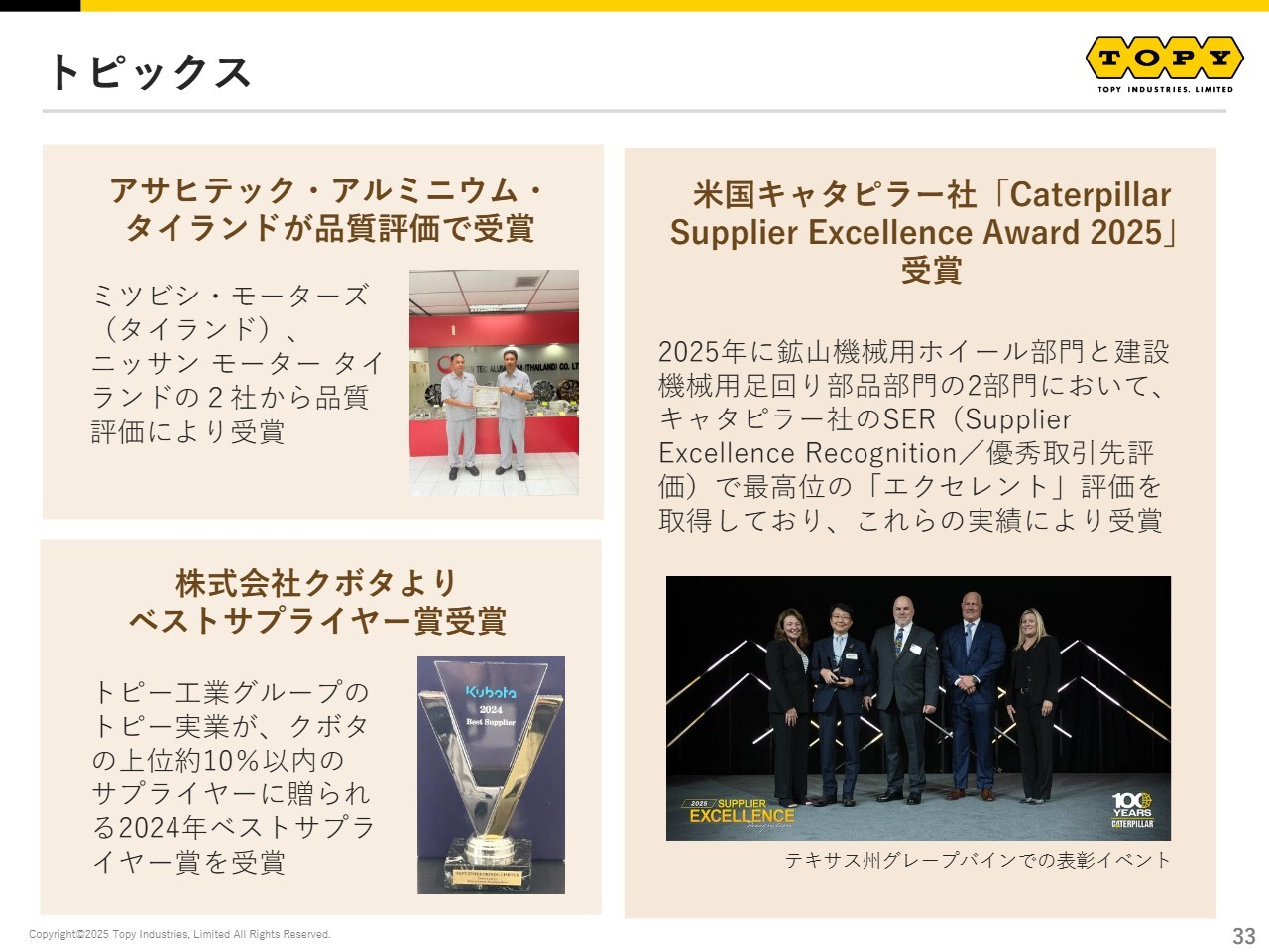 また、当社グループのトピー実業が、株式会社クボタの上位10パーセントのサプライヤーに与えられるベストサプライヤー賞を受賞しています。