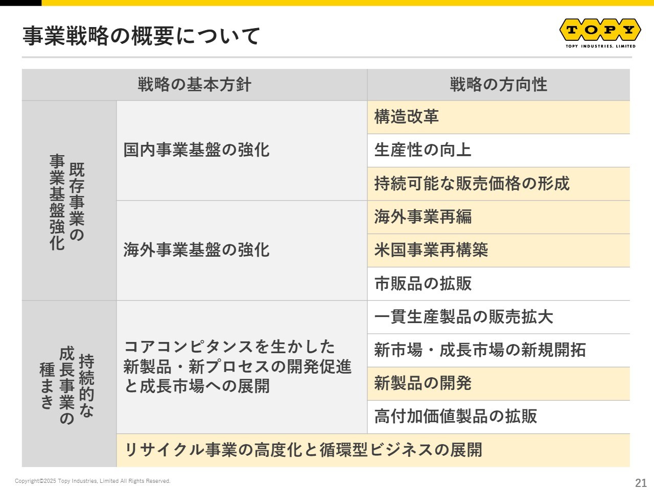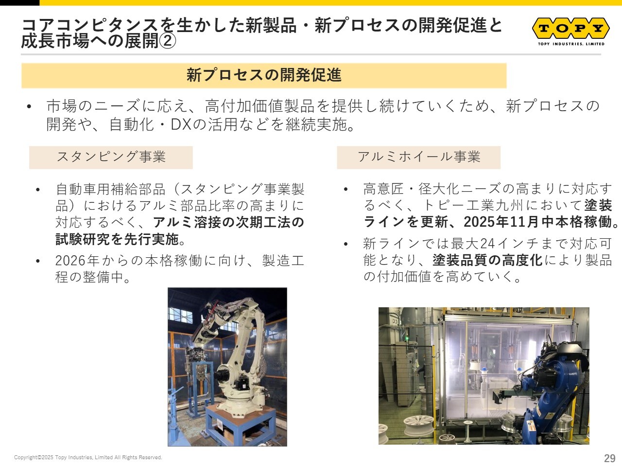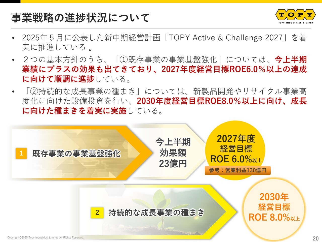 ここからは、5月に発表した新中期経営計画「TOPY Active & Challenge 2027」に掲げた事業戦略の進捗についてご説明します。