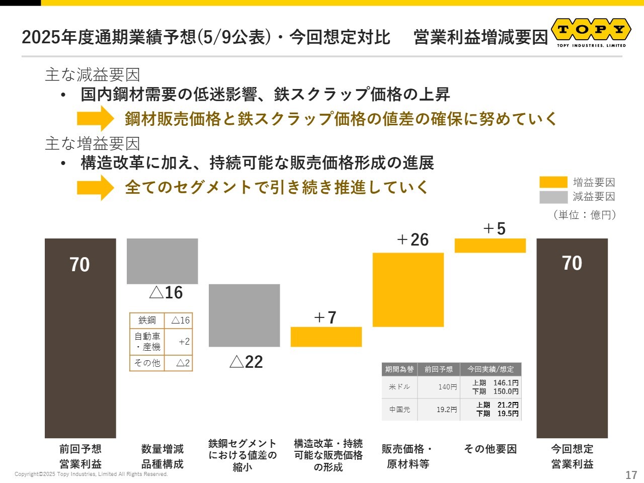 為替については、足元の円安基調を受け、1ドル150円に修正しています。米国通商政策に伴う当社の直接的な関税負担増の影響は、通期で10億円を想定していましたが、想定より縮小する見込みです。