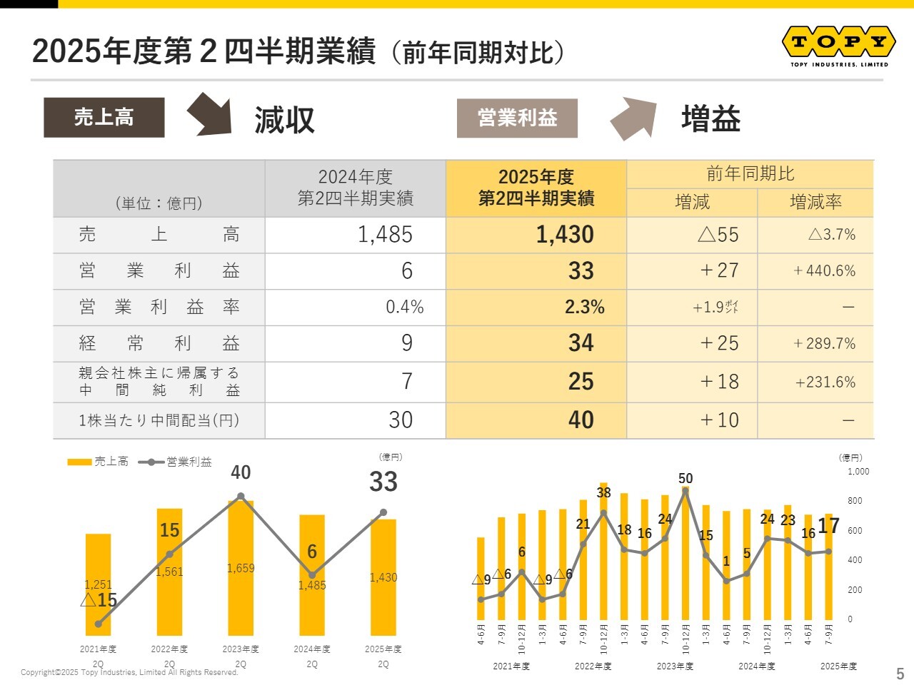 2025年度第2四半期の決算についてご説明します。業績は減収増益となり、売上高は前年同期比3.7パーセント減の1,430億円、営業利益は33億円と、前年同期の6億円から大幅に増加しました。