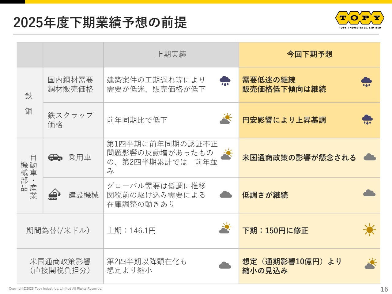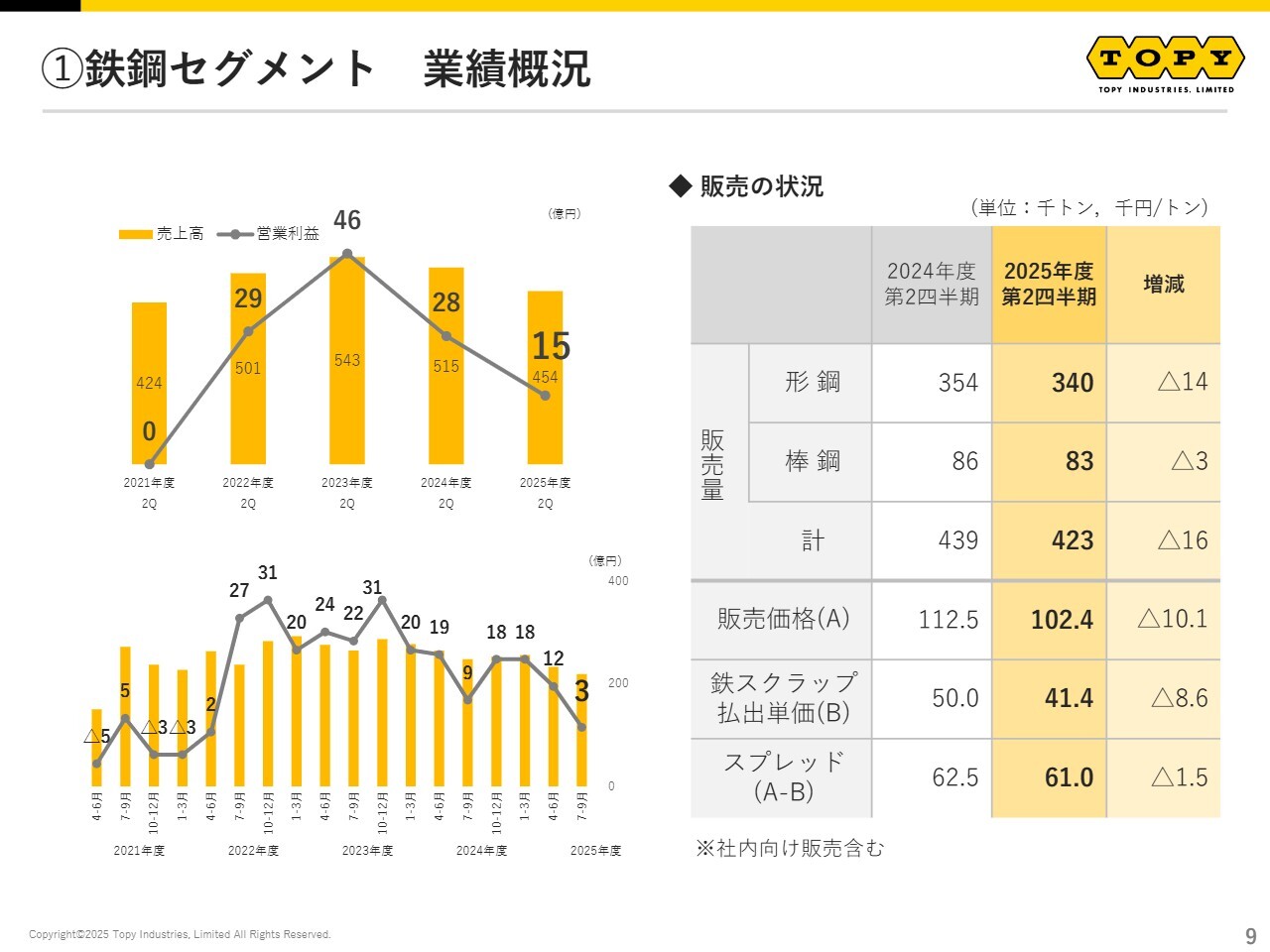 2025年度下期業績予想の前提についてご説明します。鉄鋼セグメントでは、さらに厳しい事業環境が続くと予想されます。需要の低迷に改善の兆しは見えず、販売価格の低下傾向も継続すると見込まれます。鉄スクラップ価格は円安影響により上昇しており、この傾向も継続すると考えています。