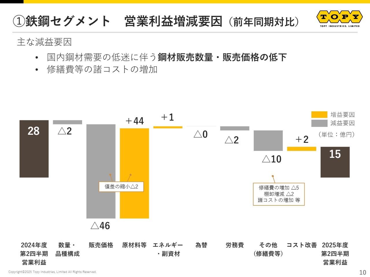 今上期は、自動車・産業機械部品セグメントの増益により、上期業績予想に対して営業利益はが16億円上振れし、33億円を達成しました。ただし、通期業績予想については据え置きとしています。鉄鋼セグメントにおいて国内鋼材需要低迷の影響が大きく、足元では鉄スクラップ価格が上昇し、かなり厳しい状況を見込んでいるためです。