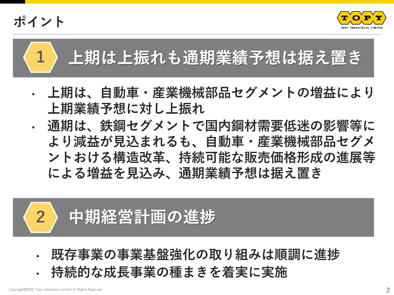 【QAあり】トピー工業、上期業績は上振れて着地 自動車・産業機械部品セグメントにおける構造改革や持続可能な販売価格の形成が奏功