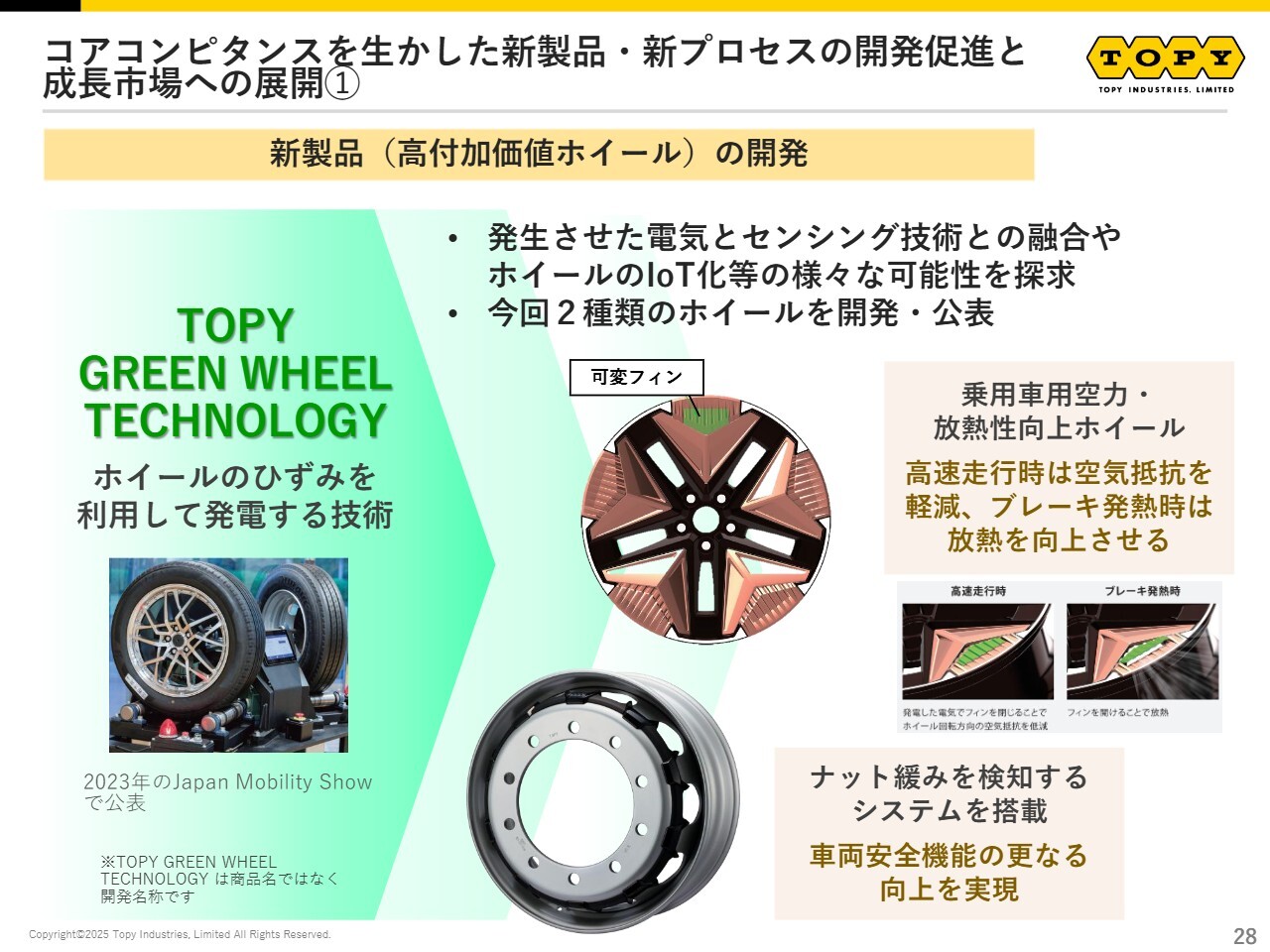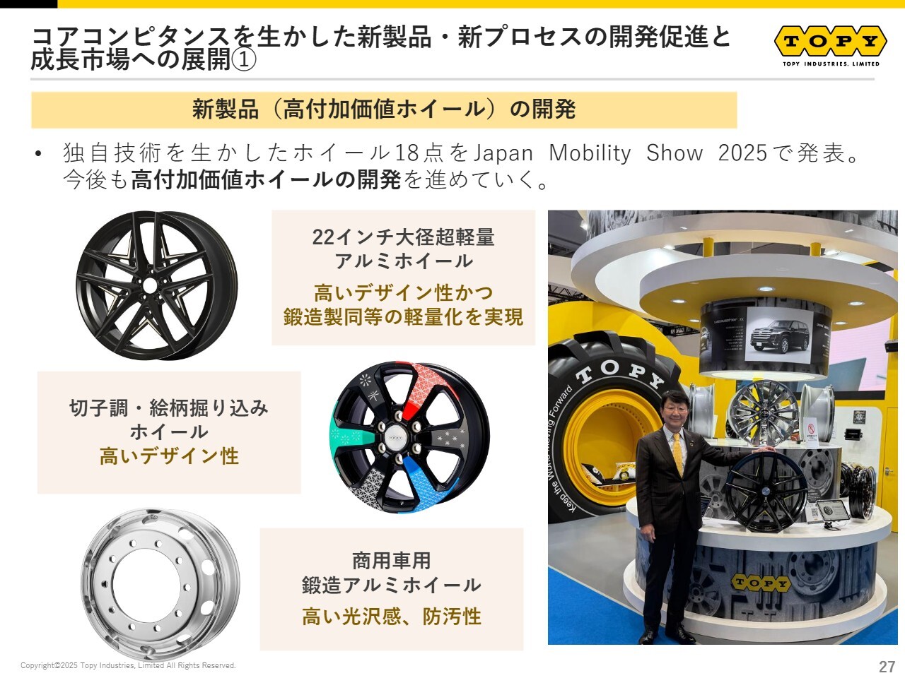 次に、コアコンピタンスを活用した新製品・新プロセスの開発促進と成長市場への展開についてご説明します。高付加価値ホイールの開発として、独自技術を活用した18点のホイールを「Japan Mobility Show 2025」にて発表しました。