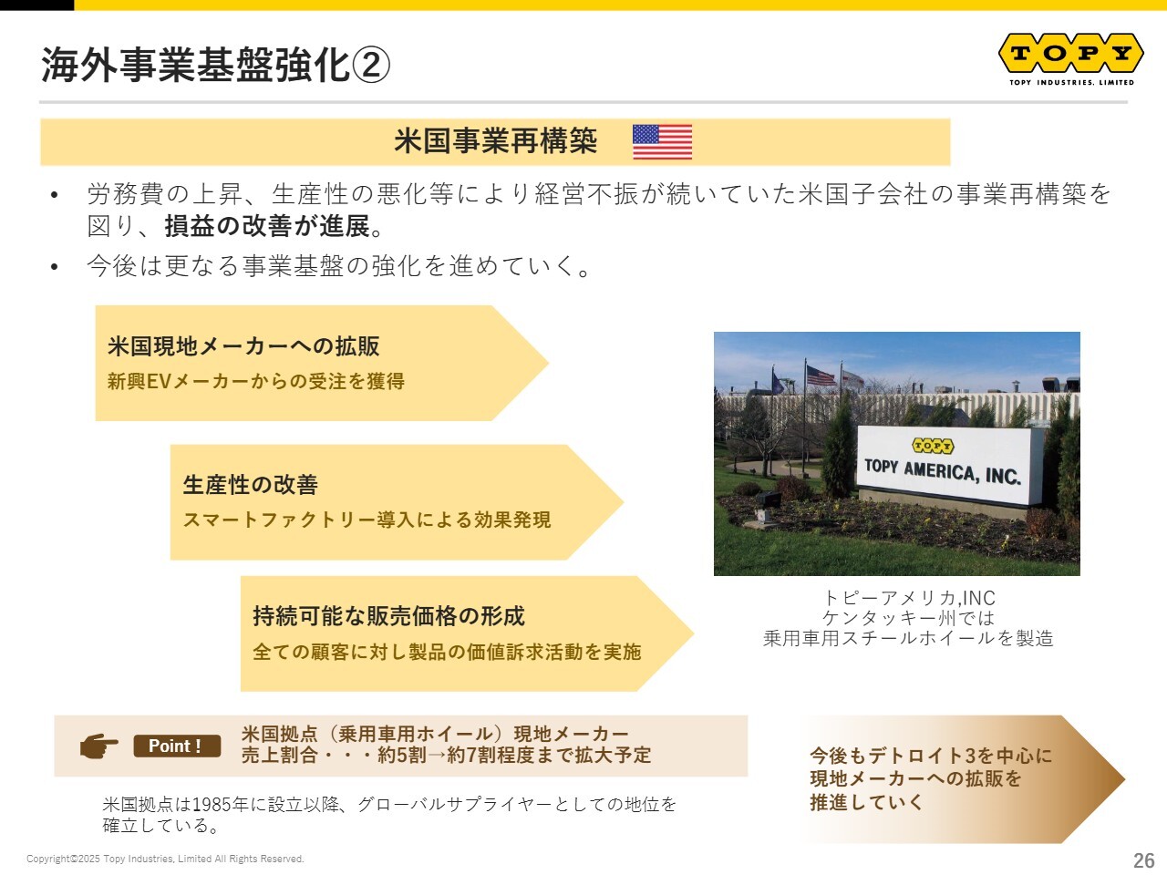 2つ目として、米国事業の再構築に注力しています。労務費の上昇や生産性の悪化等により経営不振が続いていた米国子会社トピーアメリカについて、米国現地メーカーへの拡販、生産性の改善、持続可能な販売価格の形成で事業の再構築を図り、損益の改善が着実に進展しています。