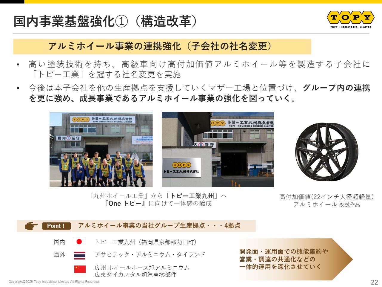 1つ目に、アルミホイール事業の連携強化に向け、子会社である九州ホイール工業の社名を変更しました。九州ホイール工業は高い塗装技術を持ち、高級車向けの高付加価値アルミホイールを製造しています。