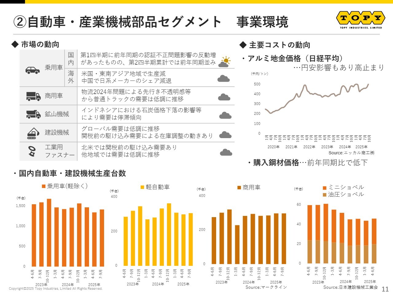 その他、乗用車の海外拠点、商用車、鉱山機械の需要については弱含みとなっています。主要コストであるアルミ地金価格は、円安の影響もあり高止まりしている状況です。一方で、購入鋼材価格は前年同期比で低下しています。