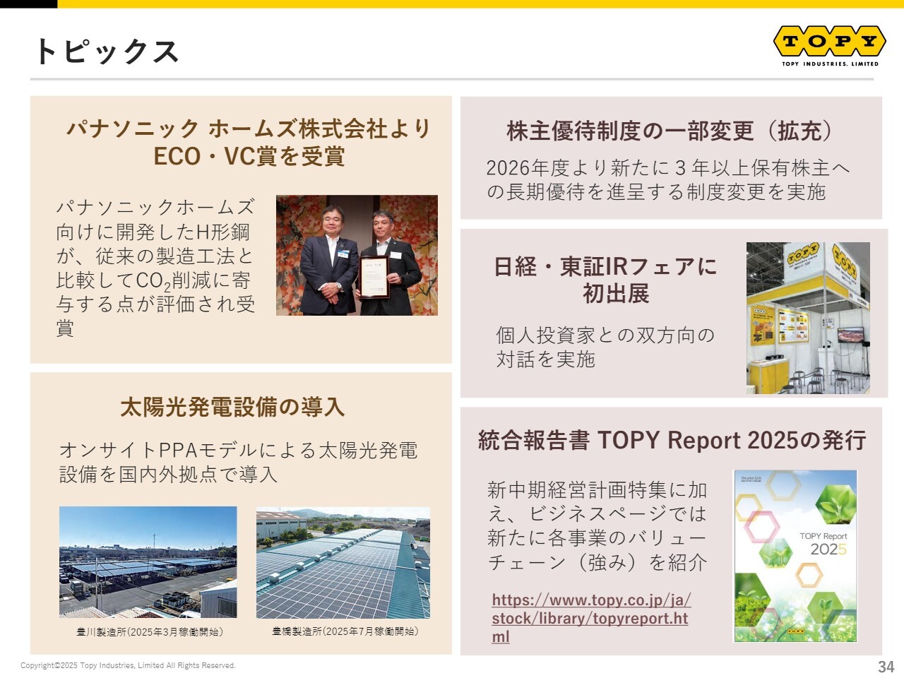 最後に、IR情報のご紹介です。2026年度より株主優待制度の一部を変更し、3年以上保有株主さまへ長期優待を進呈することとしました。9月には日経・東証IRフェアに初出展し、個人投資家さまと双方向の対話を実施しました。10月には新しい統合報告書「TOPY Report 2025」を発行しています。ぜひ当社Webサイトでご覧ください。