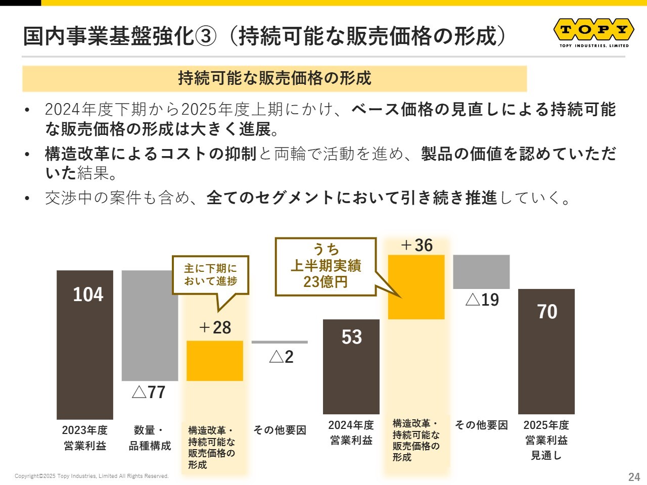 3つ目は、持続可能な販売価格の形成についてです。2024年度下期から2025年度上期にかけて、ベース価格の見直しによる持続可能な販売価格の形成が大きく進展しました。これは、構造改革によるコスト抑制と両輪で活動を進め、当社の製品価値が認められた結果だと考えています。交渉中の案件も含め、すべてのセグメントで引き続き推進していきます。