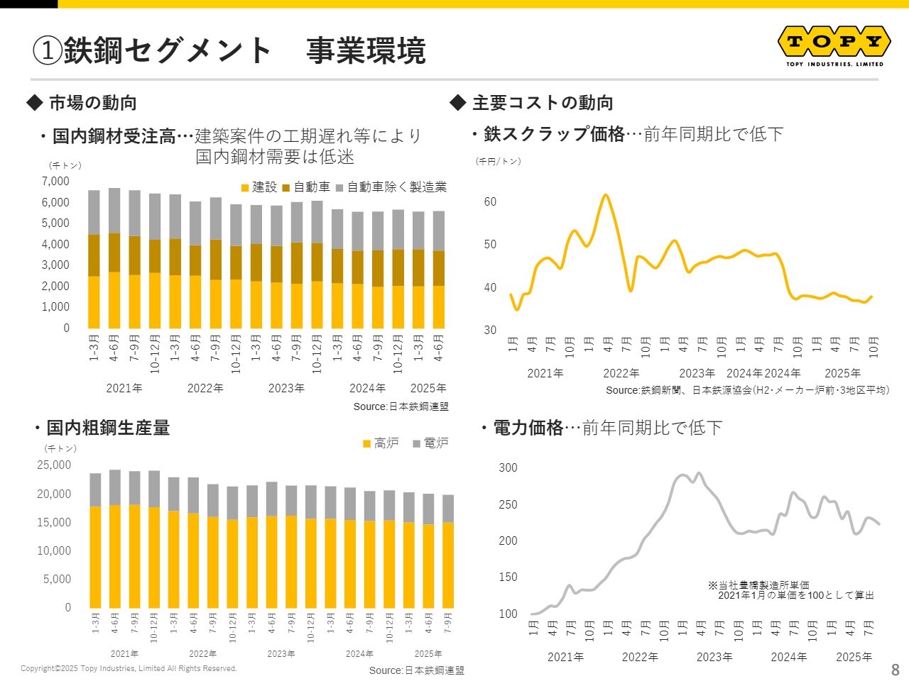 鉄鋼セグメントについてです。事業環境としては、人手不足や資材高騰による建設案件の工期遅れなどにより、国内鋼材需要は低迷しています。主要コストである鉄スクラップ価格と電力価格は、前年同期と比べて低い水準で推移しています。