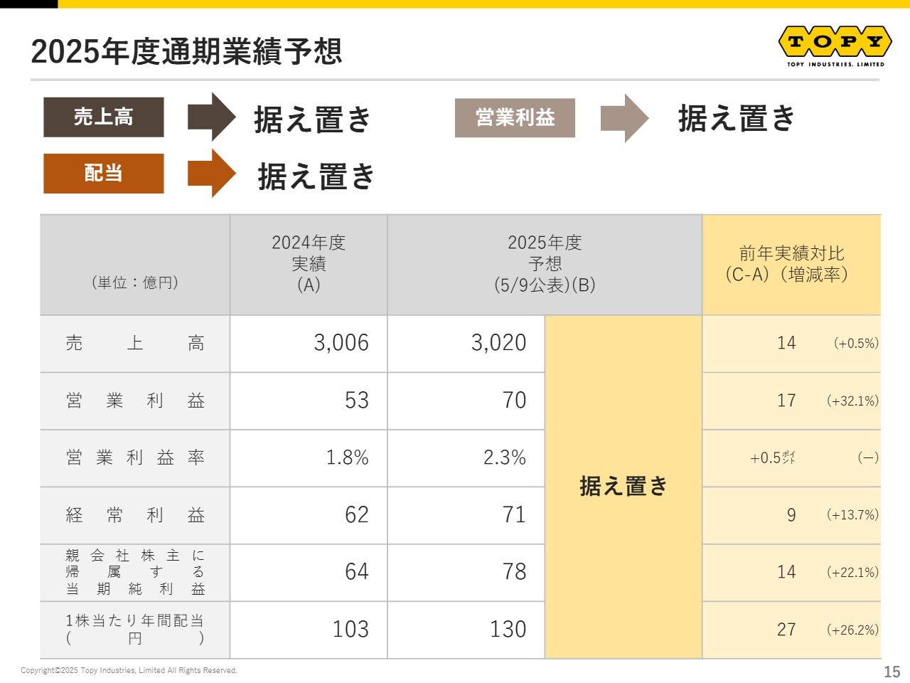 2025年度通期業績予想については据え置きとしています。年間配当も130円の予想を据え置いています。