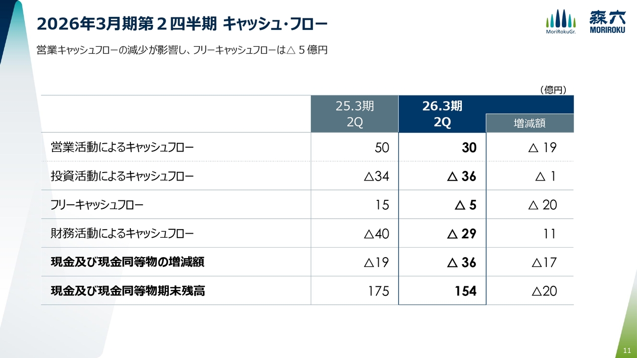 キャッシュ・フローについてです。前年同期に比べて営業キャッシュ・フローが減少した結果、フリーキャッシュ・フローはマイナス5億円、期末の現金および現金同等物の残高は154億円となりました。