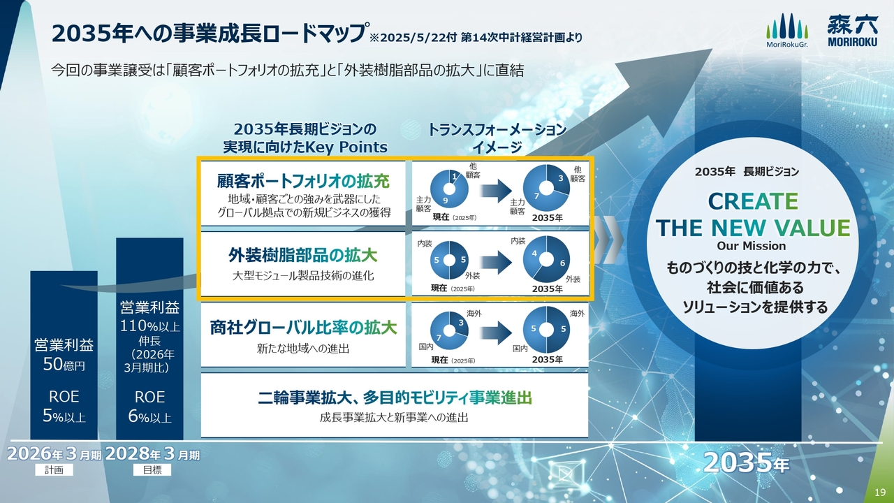 スライドは、2025年5月に公表した当社の長期ビジョンです。長期ビジョン実現に向けたキーポイントは大きく4つあります。今回の事業譲受は、そのうちの2つの重点テーマである「顧客ポートフォリオの拡充」「外装樹脂部品の拡大」に直結し、当社の中長期的な企業価値の向上につながるものです。