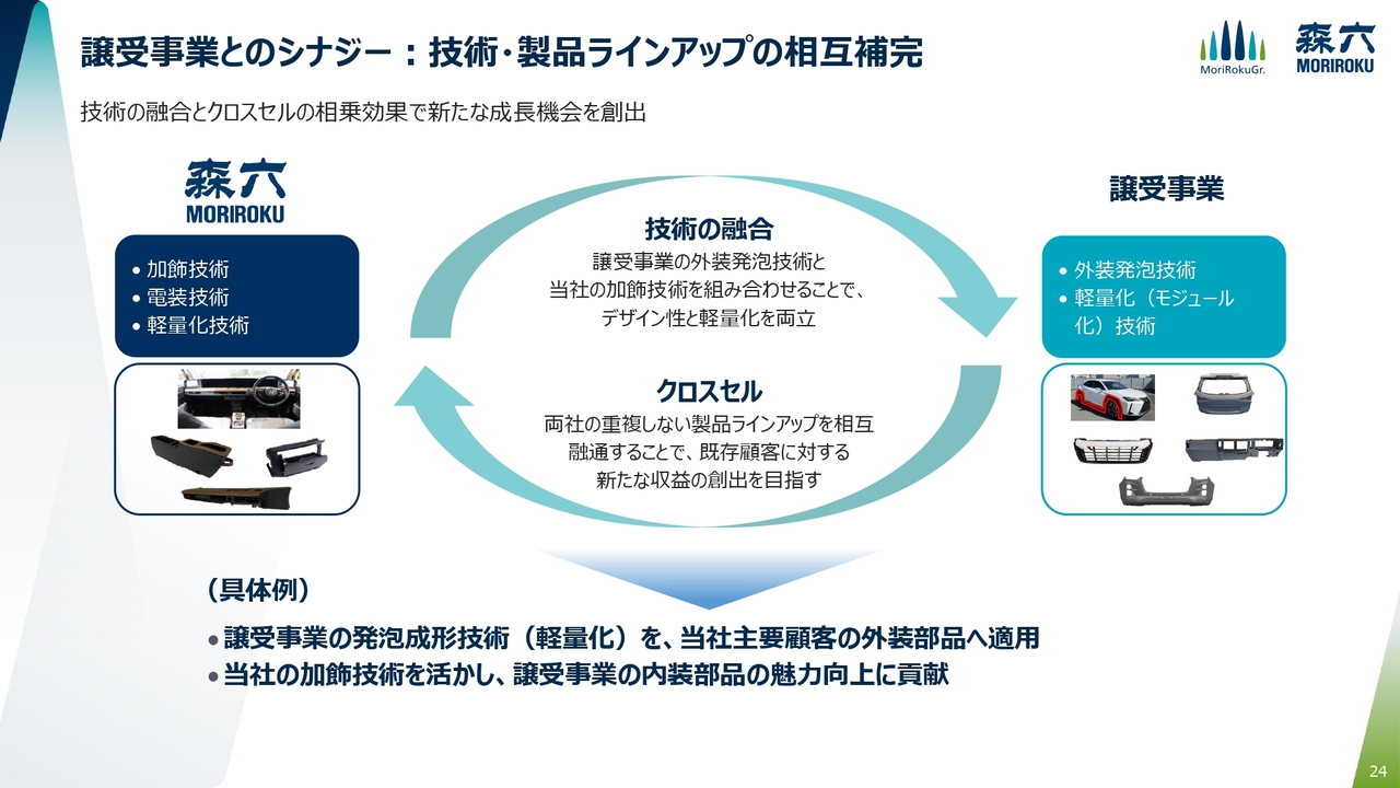 営業面では、譲受事業が持つ外装発泡技術やモジュール化による軽量化技術と、当社が有する加飾・電装技術を組み合わせ、顧客への提案力を強化します。また、既存顧客へのクロスセルを進め、さらなるビジネス拡大につなげていきます。
