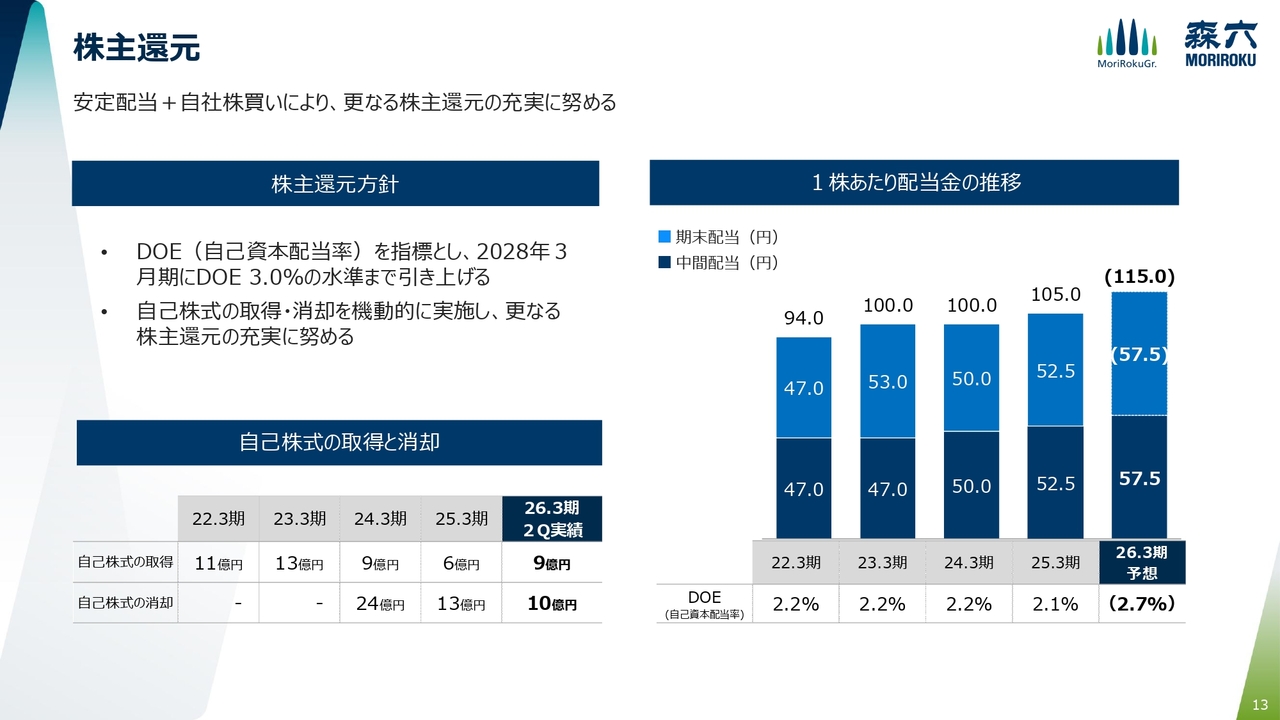 株主還元についてです。中間配当は期初の予想どおり57.5円としました。年間配当115円、DOE2.7パーセントも変更はありません。自己株式については、2026年6月までに10億円規模の取得を完了し、取得分はすべて消却しています。