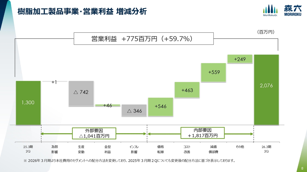 樹脂加工製品事業の営業利益分析です。生産変動やインフレによるコスト上昇の影響で外部要因はマイナスとなりましたが、価格転嫁やコスト改善に加え、前期の減損に伴う減価償却費の減少もプラスに寄与し、営業利益は前年同期比60パーセント増となりました。
