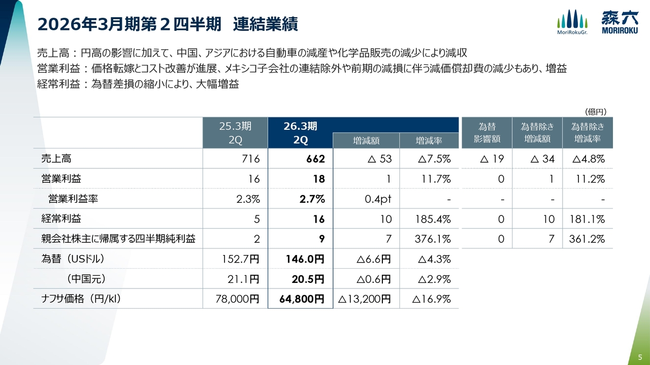 以上のような事業環境のもと、2026年3月期第2四半期の連結業績はスライドのとおりとなりました。売上高は、円高の影響に加え、中国やアジアにおける自動車の減産や化学品販売の減少により、前年同期比マイナス8パーセントの減収となりました。