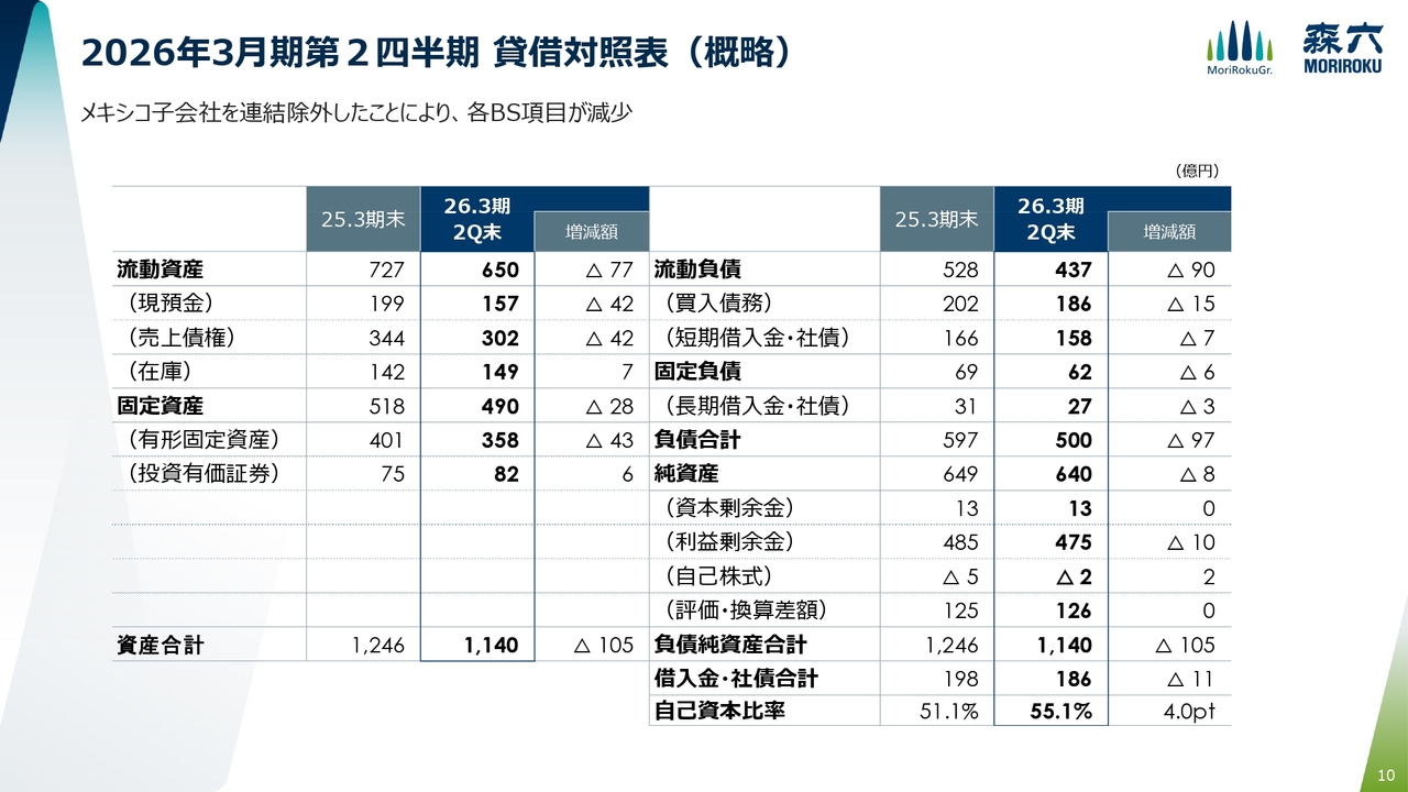 続いて、バランスシートについてです。メキシコ子会社の連結除外により、各バランスシート項目が減少しています。自己資本比率は4ポイント上昇して55パーセントとなり、引き続き安定した財務基盤を維持しています。