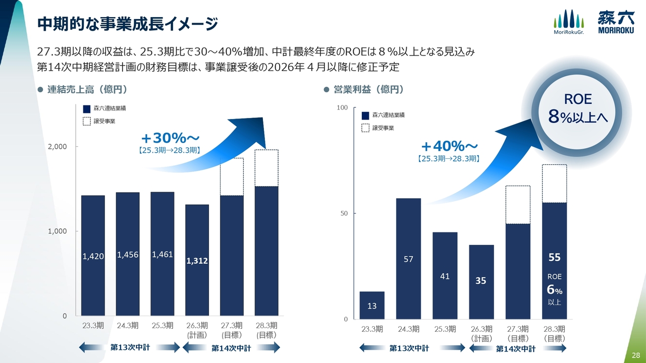 したがって、第14次中期経営計画では、最終年度である2028年3月期の財務目標を営業利益55億円以上、ROE6パーセント以上と設定していますが、今回の譲受に伴い財務目標の修正が必要となります。こちらについては、2026年4月の事業統合後にあらためて精査し、公表する予定です。