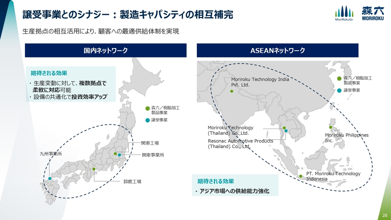 続いて、生産面についてです。譲受事業の国内・タイの生産拠点は、当社の生産拠点と相互補完関係にあり、生産・物流の効率化が期待できます。