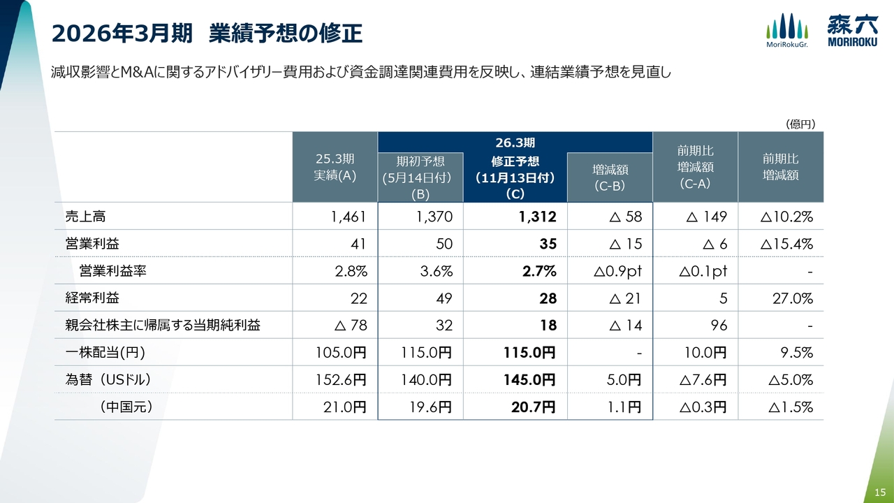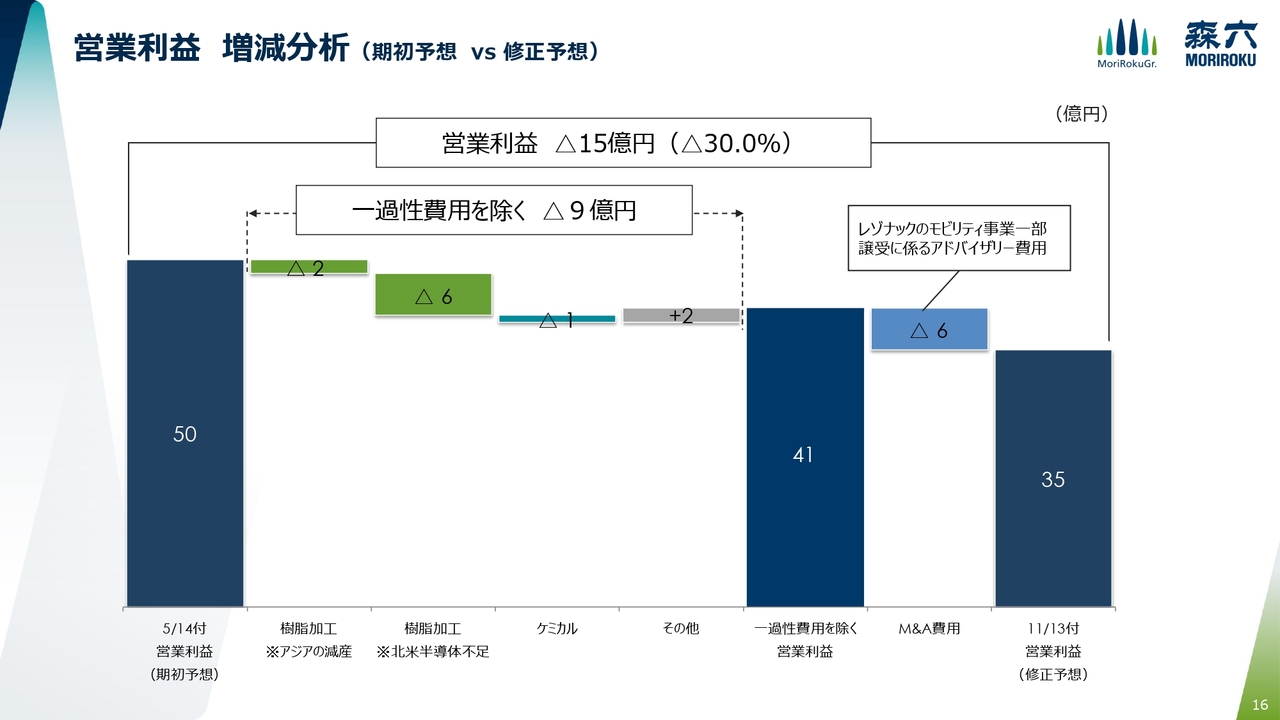 これにM&Aに関するアドバイザリー費用6億円を加え、合計でマイナス15億円の減益を見込んでいます。