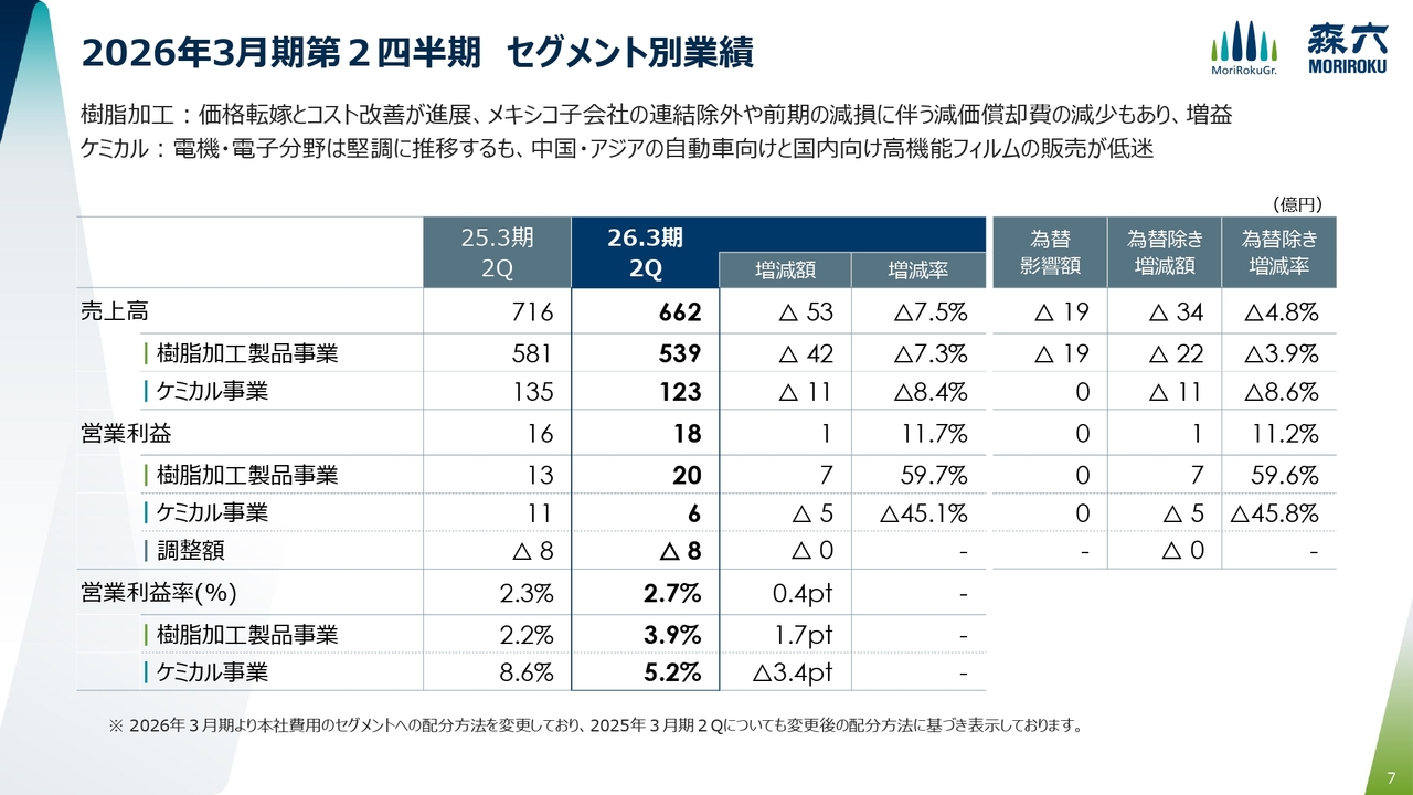 セグメント別では、樹脂加工製品事業が売上高539億円、営業利益20億円で減収増益となり、ケミカル事業が売上高123億円、営業利益6億円で減収減益となりました。
