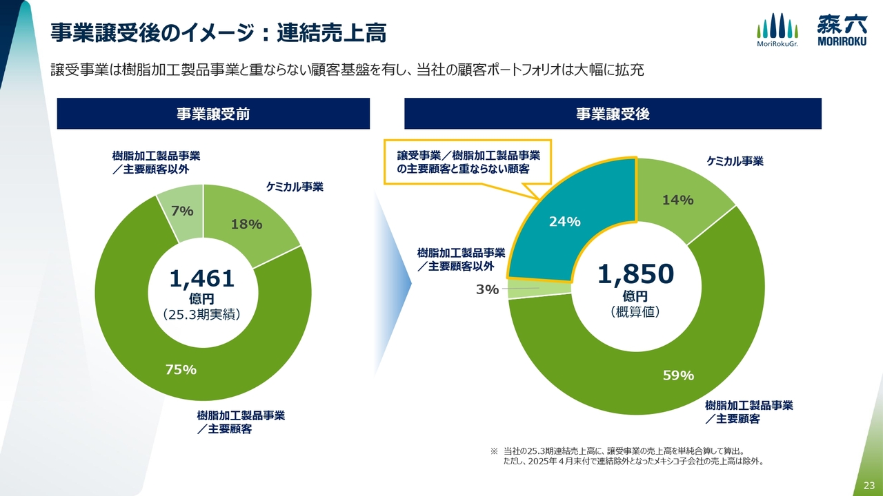 事業譲受前後の売上高のイメージです。現在、当社の樹脂加工製品事業は、売上の大部分を主要顧客が占めています。ここに譲受事業が加わることで、売上構成はスライド右のグラフのように変化します。
