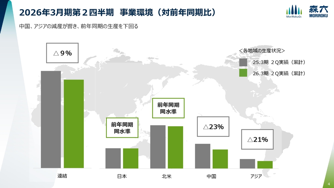 こちらは、前年同期比での生産状況を示したものです。日本と北米は前年同期とほぼ同水準を維持したものの、中国やアジアでの減産が影響し、全体としては前年同期を下回る結果となりました。