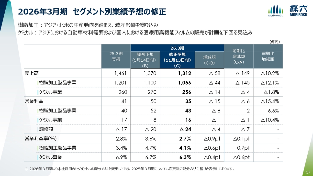 セグメント別の見通しは、樹脂加工製品事業においてアジアと北米の減産を織り込み、売上高は前回予想比44億円減の1,056億円、営業利益は8億円減の43億円としています。